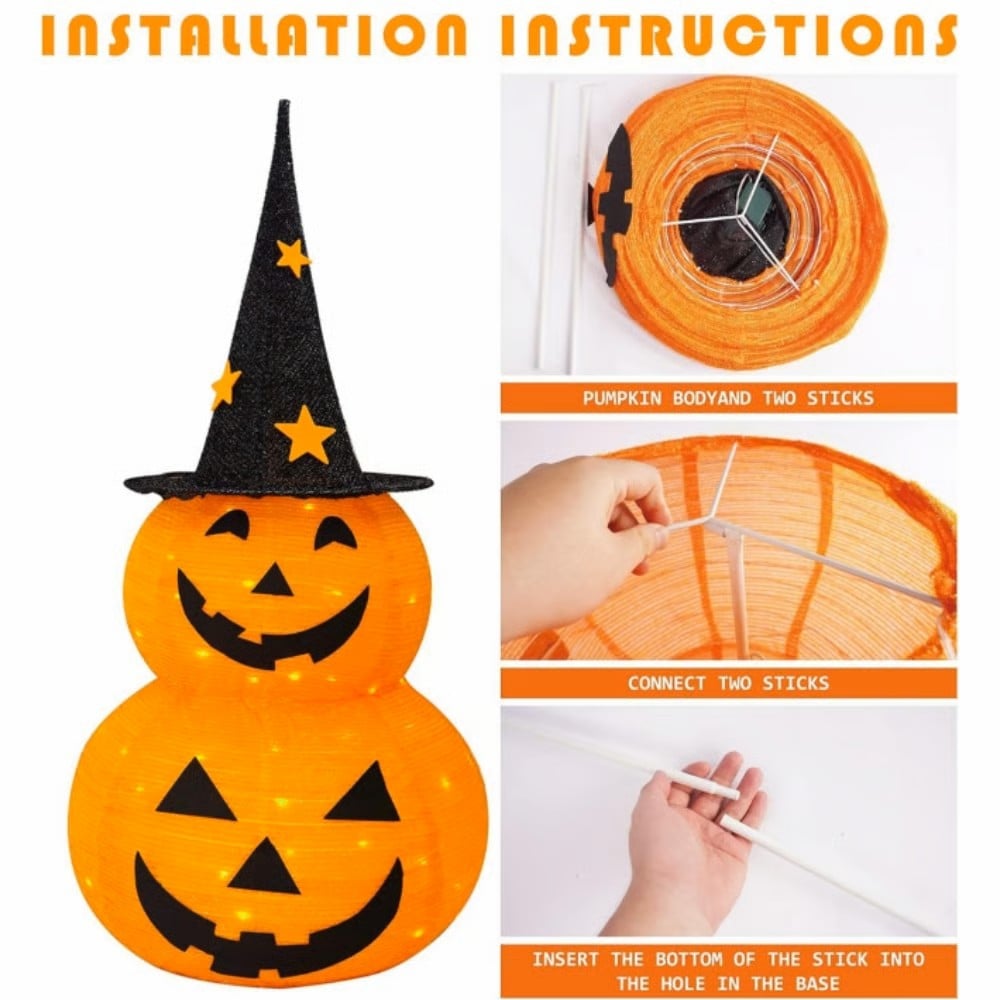 Don't need tools to install, you can install the pumpkin with few minutes. Just connect the first pole with the base and then connect the second pole with the first pole. Then fixed the pumpkinman. Please refer to the instruction manual for specific installation steps. If not in use, it can be folded up and save your space.
