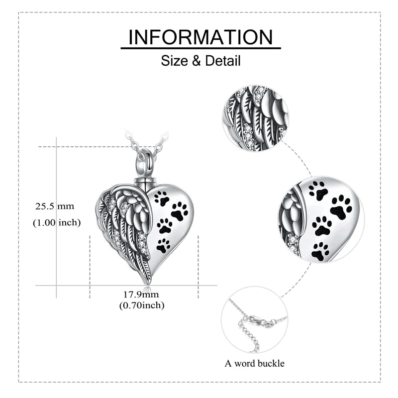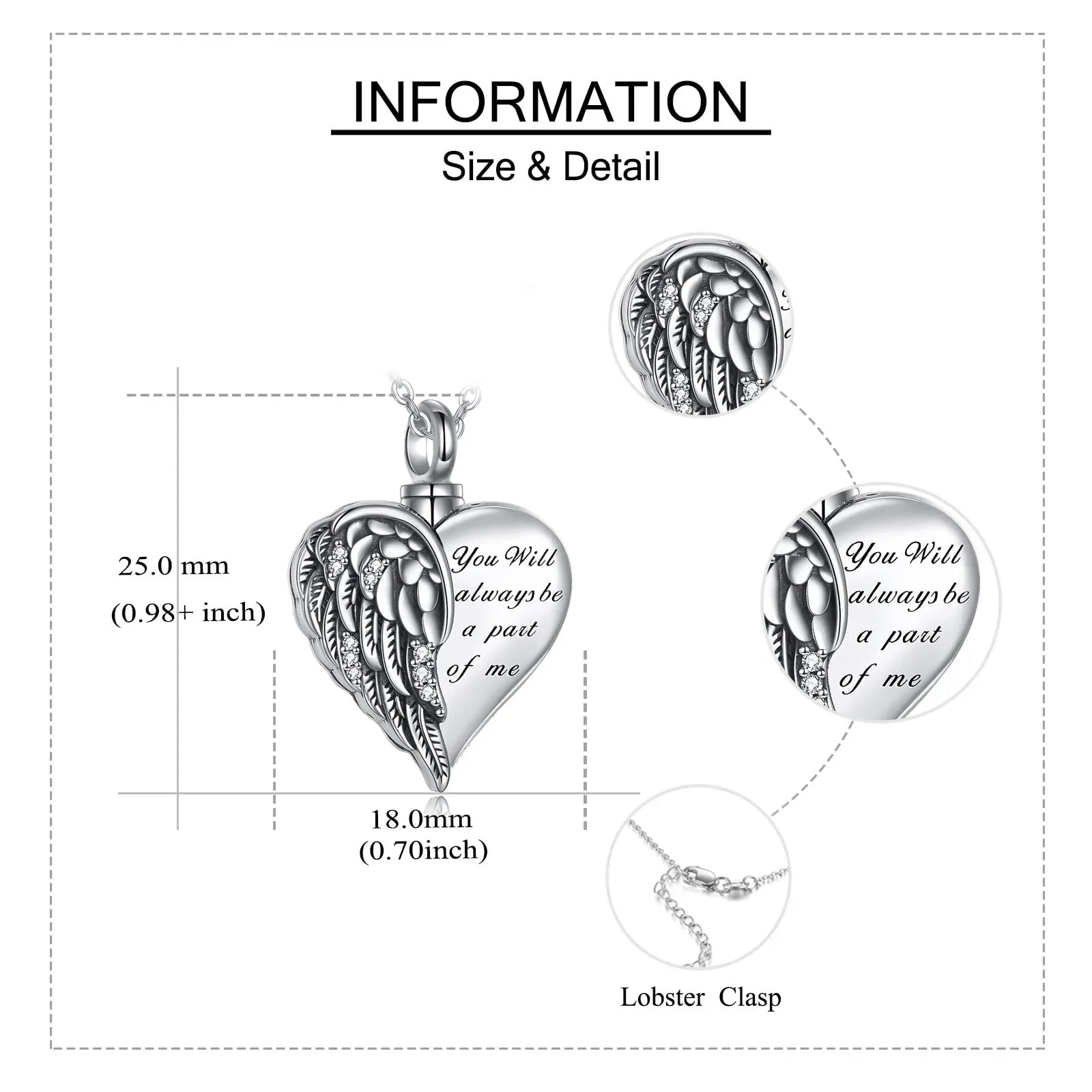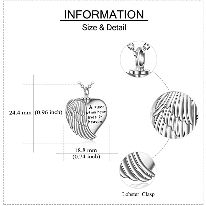Style A: Wings pendant: 24.4*18.8 mm(0.96*0.74 inch). Chain length: 18"+2 inch extension chain. packaging: 1 x heart urn necklace; 1 x polishing cloth and 1 x exquisite gift box.